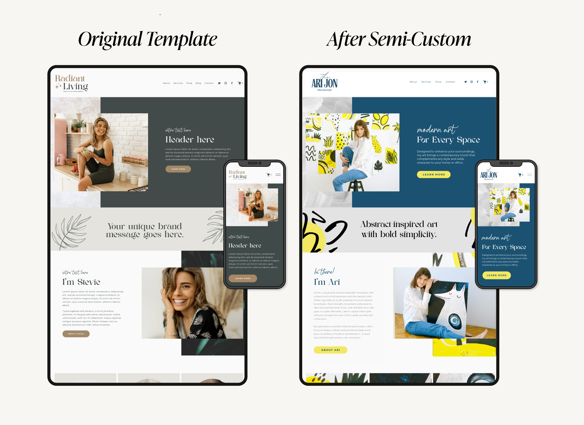 • A semi-custom website uses one of our professionally designed Squarespace templates as the foundation. We then customize it with your brand’s photos, logo, copy, and colors so it looks and feels like your site, not just a template.